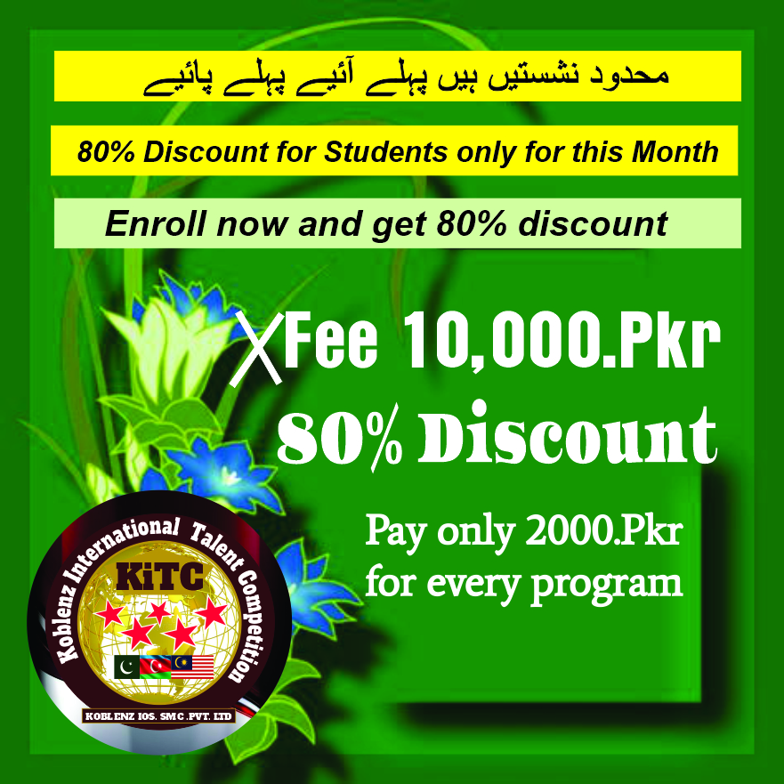 Ā PKR 10000 / USD 35 percategory (Non-Refundable)āļø Participation Limit: 80% discount for students of PakistaniĀ Ā universities, their payable fee is only Pkr 2000.Each candidate can participate in up t three (3) categoriesĀ Ā Ā (programsĀ at a time.