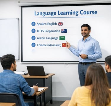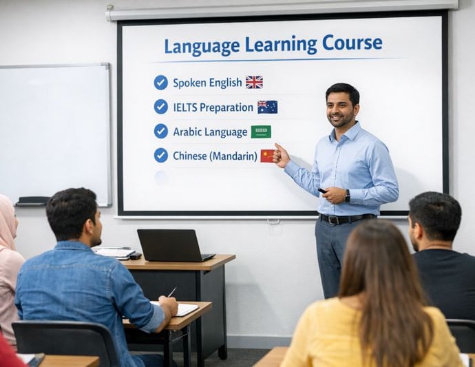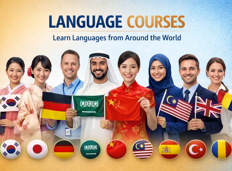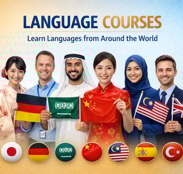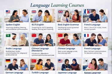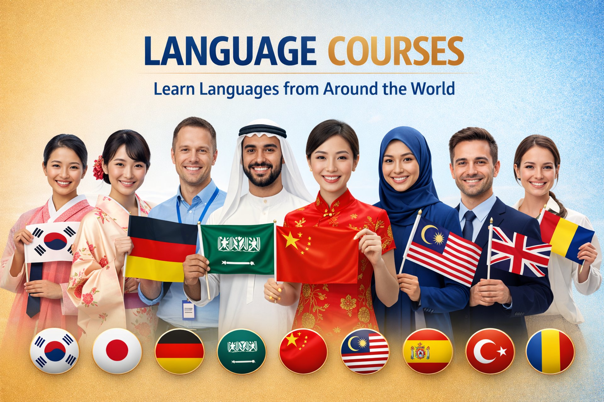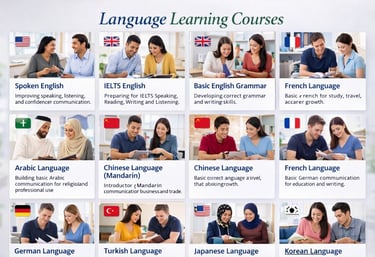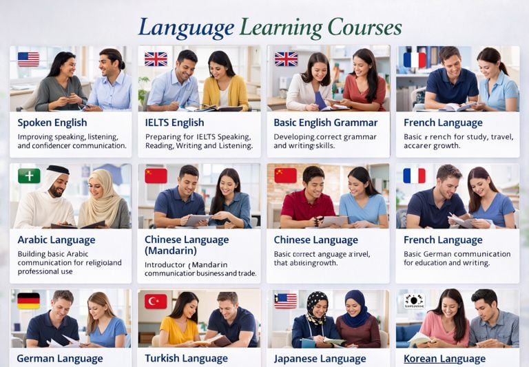 Spoken EnglishThis course focuses on improving daily conversation, pronunciation, listening skills, and confidence for education, employment, and professional communication.IELTS EnglishDesigned to prepare students for the IELTS examination, covering all four modules: Speaking, Reading, Writing, and Listening.Basic English GrammarA foundational course to develop correct sentence structure, tenses, and writing skills for beginners.Arabic LanguageThis course develops basic Arabic speaking, reading, and writing skills for religious, educational, and professional purposes.Chinese Language (Mandarin)An introductory course covering basic Mandarin communication skills for business, trade, and international interaction.French LanguageThis course builds basic French speaking, listening, and comprehension skills for study, travel, and career growth.German LanguageDesigned to develop basic German communication skills for education, employment, and migration opportunities.Turkish LanguageLearn basic Turkish speaking and understanding skills for cultural, educational, and professional use.Malaysian Language (Bahasa Melayu)An introductory course focusing on basic communication skills for travel, study, and work purposes.Spanish LanguageThis course provides basic Spanish speaking and comprehension skills for international communication and career opportunities.Romanian LanguageLearn basic Romanian language skills for employment, migration, and daily communication.Japanese LanguageAn introductory course covering basic Japanese speaking and writing skills for beginners.Korean LanguageThis course focuses on basic Korean conversation and Hangul writing, suitable for cultural and professional interests.