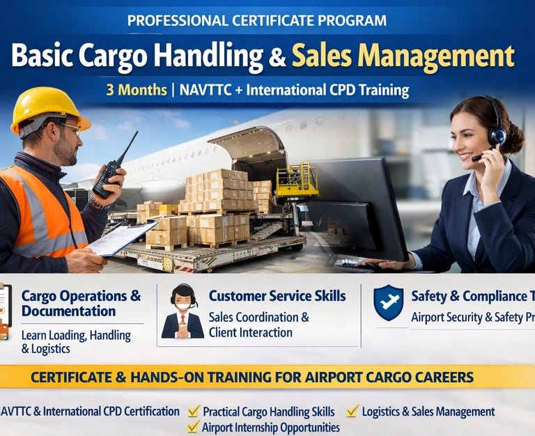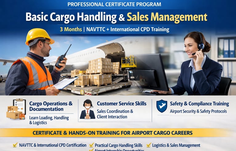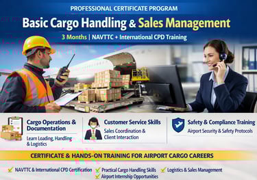 The Basic Cargo Handling and Sales Management course prepares students for entry-level careers in airport cargo and logistics operations. This program introduces essential cargo procedures, documentation, customer service, and sales coordination used in aviation and freight environments