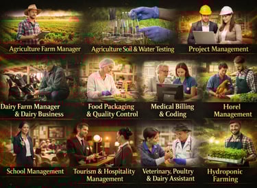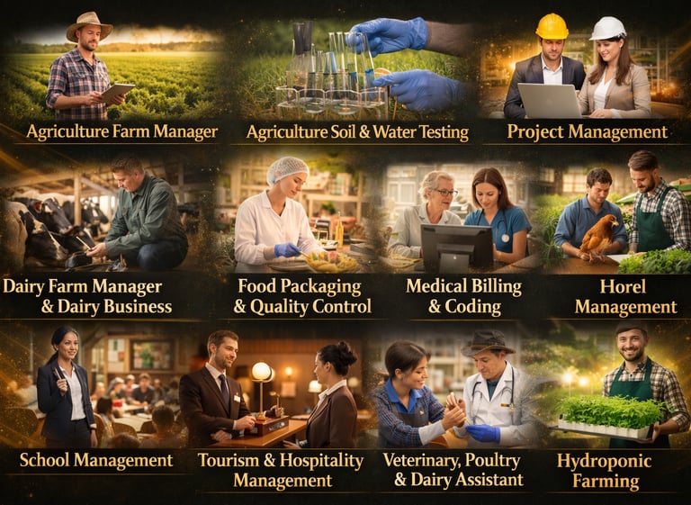 Agriculture & Farming: Farm Manager, Soil & Water Testing, Dairy Farm Management, Hydroponic Farming.
