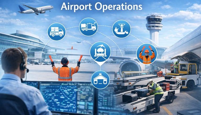 The Airport Operations Course provides a comprehensive understanding of airport management, ramp operations, and safety & security procedures. This course is ideal for individuals aiming to pursue a professional career in airport operations and ground services. Airport Management – Learn about airport administration, operational procedures, and regulatory compliance.✈️ Ramp Operations – Understand aircraft turnaround, ground handling, and coordination between airport teams. Safety & Security – Gain knowledge of airport safety standards, emergency procedures, and securityprotocols.