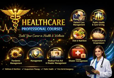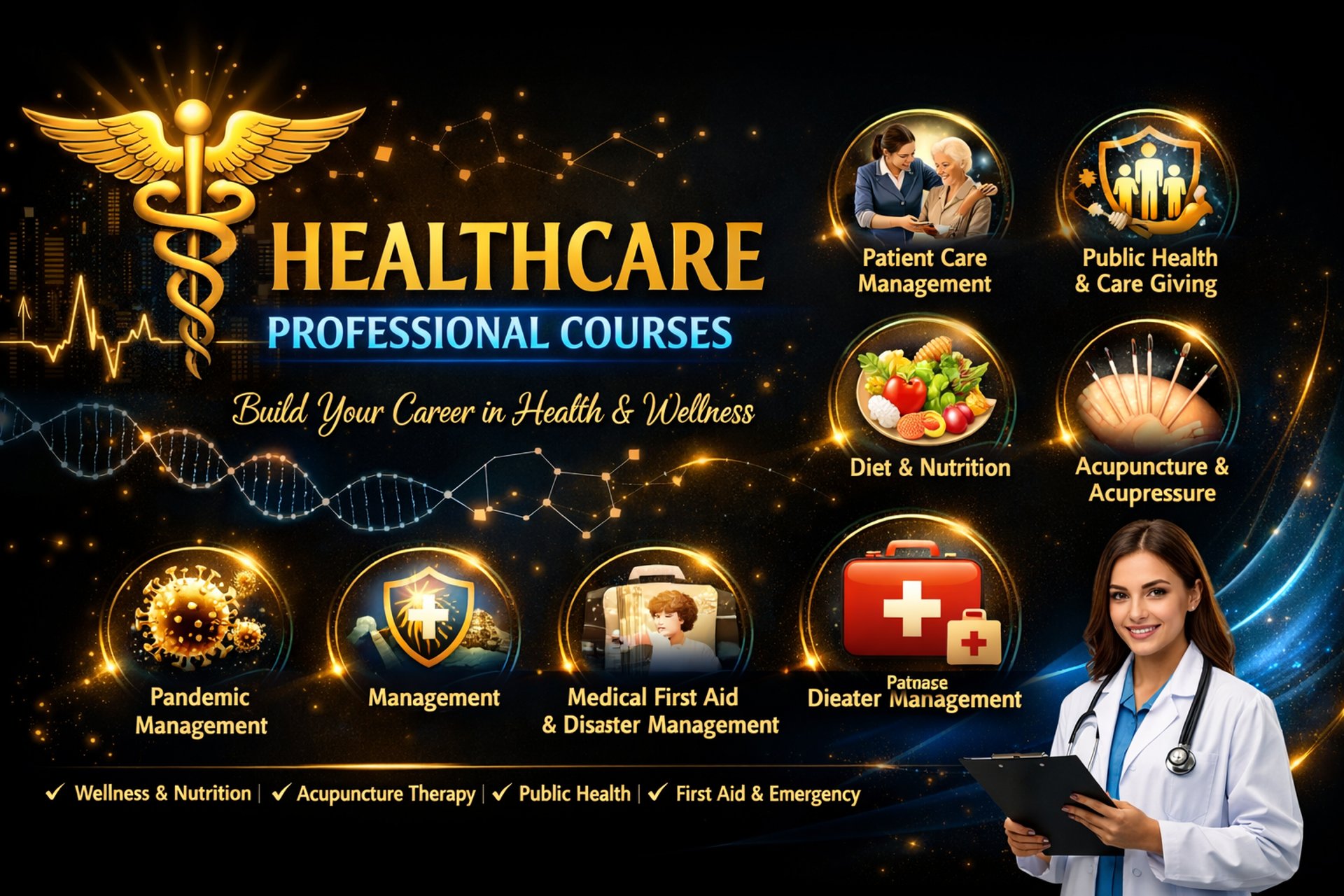 Patient care management Public health Care given Diet & Nutrition Acupuncture therapy, Acupressure Therapy, Pandemic management Medical first aid & disaster management. And More health courses