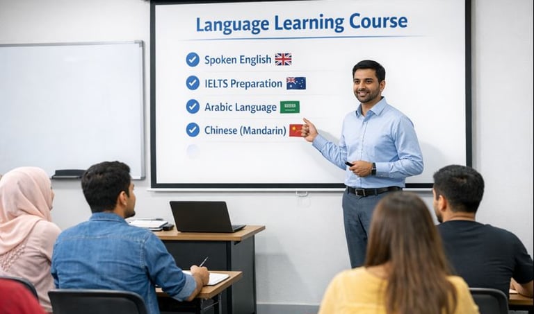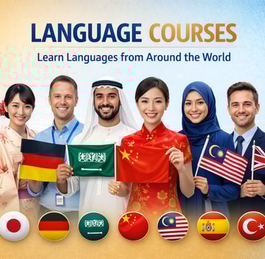 Spoken EnglishThis course focuses on improving daily conversation, pronunciation, listening skills, and confidence for education, employment, and professional communication.IELTS EnglishDesigned to prepare students for the IELTS examination, covering all four modules: Speaking, Reading, Writing, and Listening.Basic English GrammarA foundational course to develop correct sentence structure, tenses, and writing skills for beginners.Arabic LanguageThis course develops basic Arabic speaking, reading, and writing skills for religious, educational, and professional purposes.Chinese Language (Mandarin)An introductory course covering basic Mandarin communication skills for business, trade, and international interaction.French LanguageThis course builds basic French speaking, listening, and comprehension skills for study, travel, and career growth.German LanguageDesigned to develop basic German communication skills for education, employment, and migration opportunities.Turkish LanguageLearn basic Turkish speaking and understanding skills for cultural, educational, and professional use.Malaysian Language (Bahasa Melayu)An introductory course focusing on basic communication skills for travel, study, and work purposes.Spanish LanguageThis course provides basic Spanish speaking and comprehension skills for international communication and career opportunities.Romanian LanguageLearn basic Romanian language skills for employment, migration, and daily communication.Japanese LanguageAn introductory course covering basic Japanese speaking and writing skills for beginners.Korean LanguageThis course focuses on basic Korean conversation and Hangul writing, suitable for cultural and professional interests.