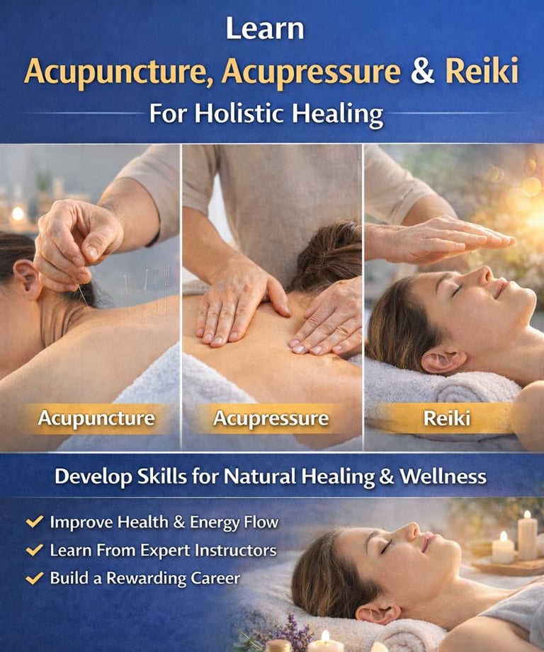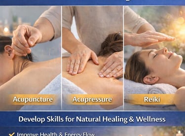 Comprehensive therapy training programs in Acupuncture, Acupressure, and Reiki, focused on practical healing techniques and holistic wellness. Ideal for individuals seeking professional skills in alternative and complementary therapies.